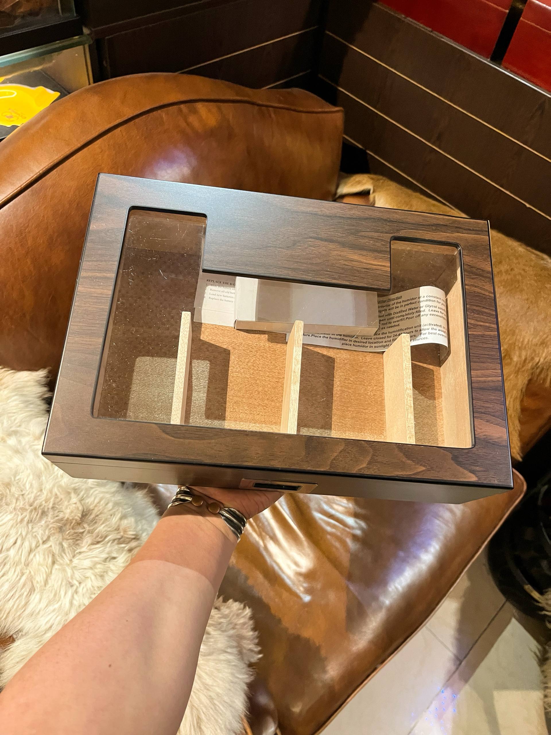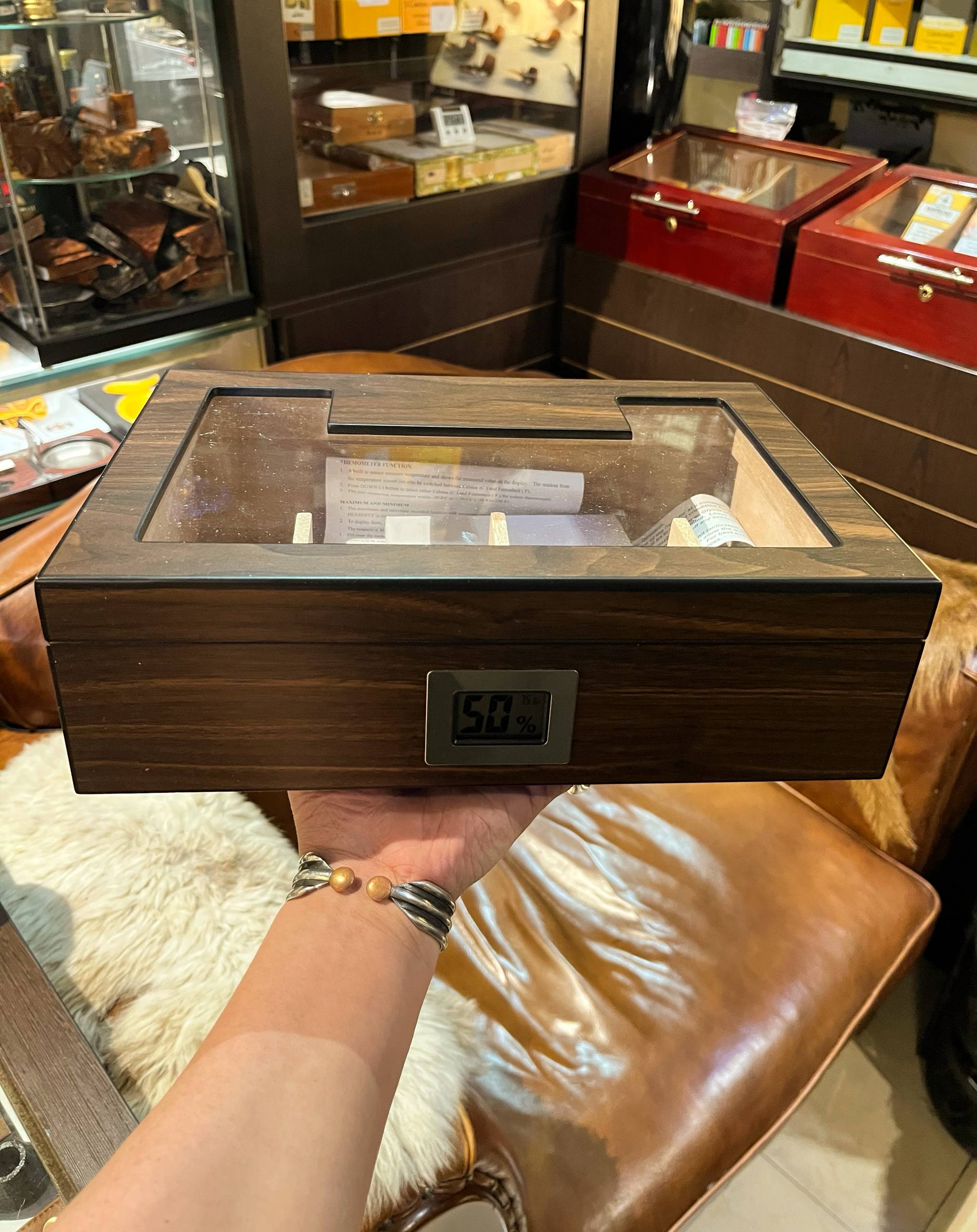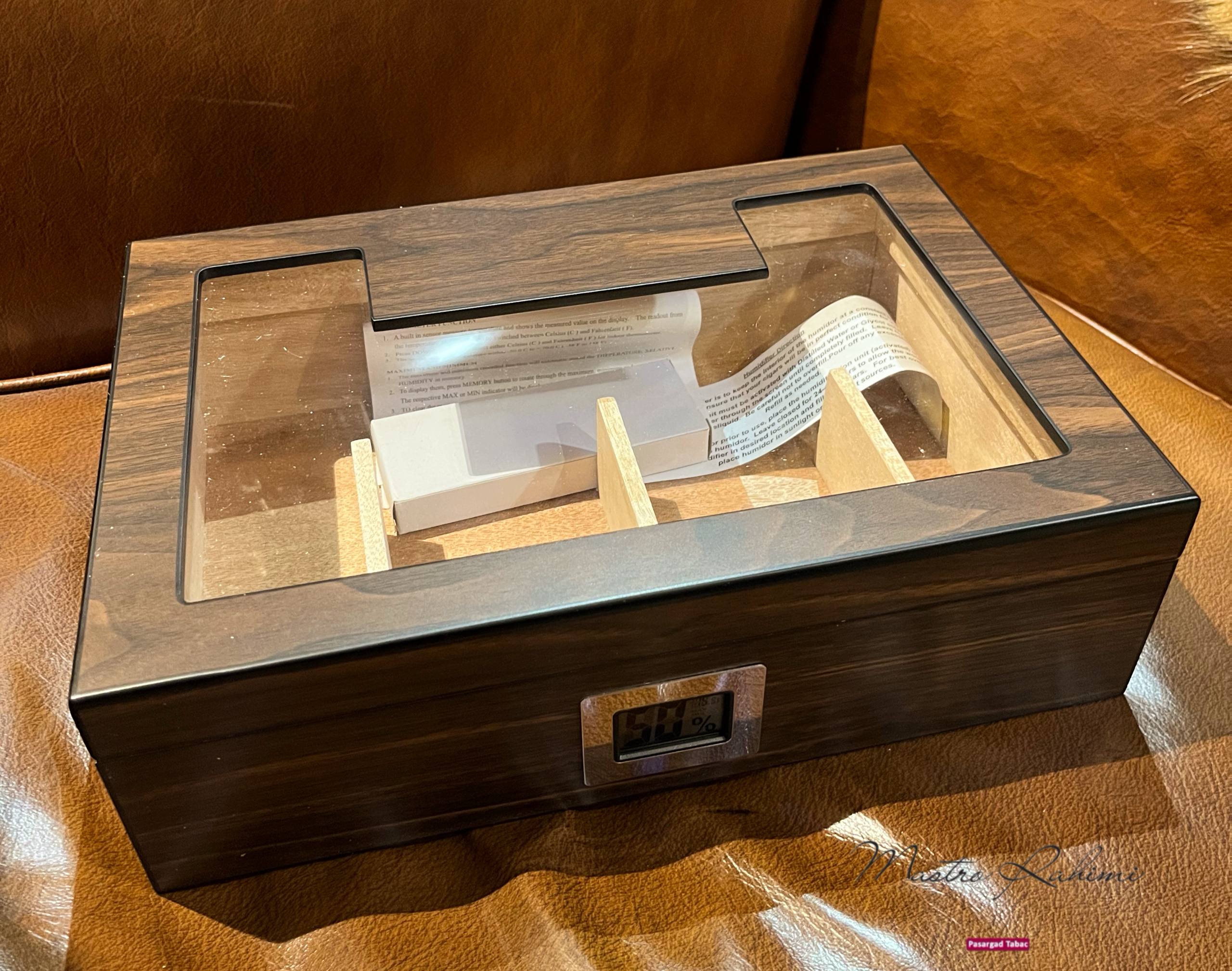 SCATOLA UMIDIFICATA con humidor interno e igrometro digitale con lettura esterna. Top in vetro permette di vedere i propri sigari.