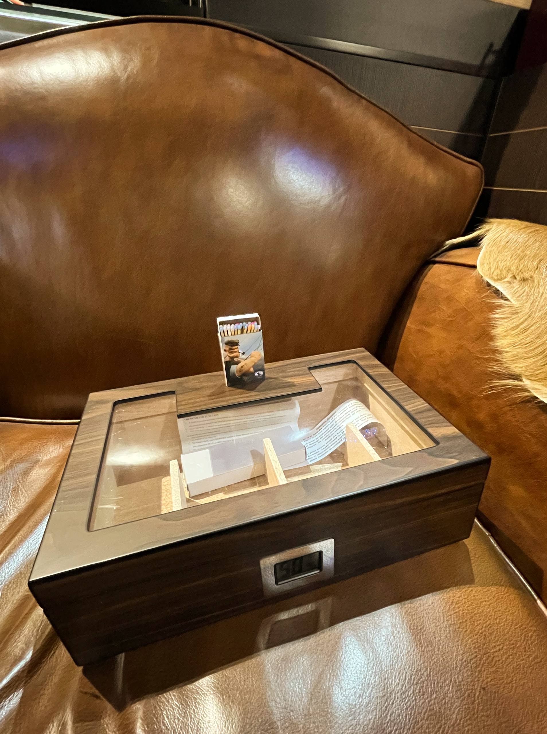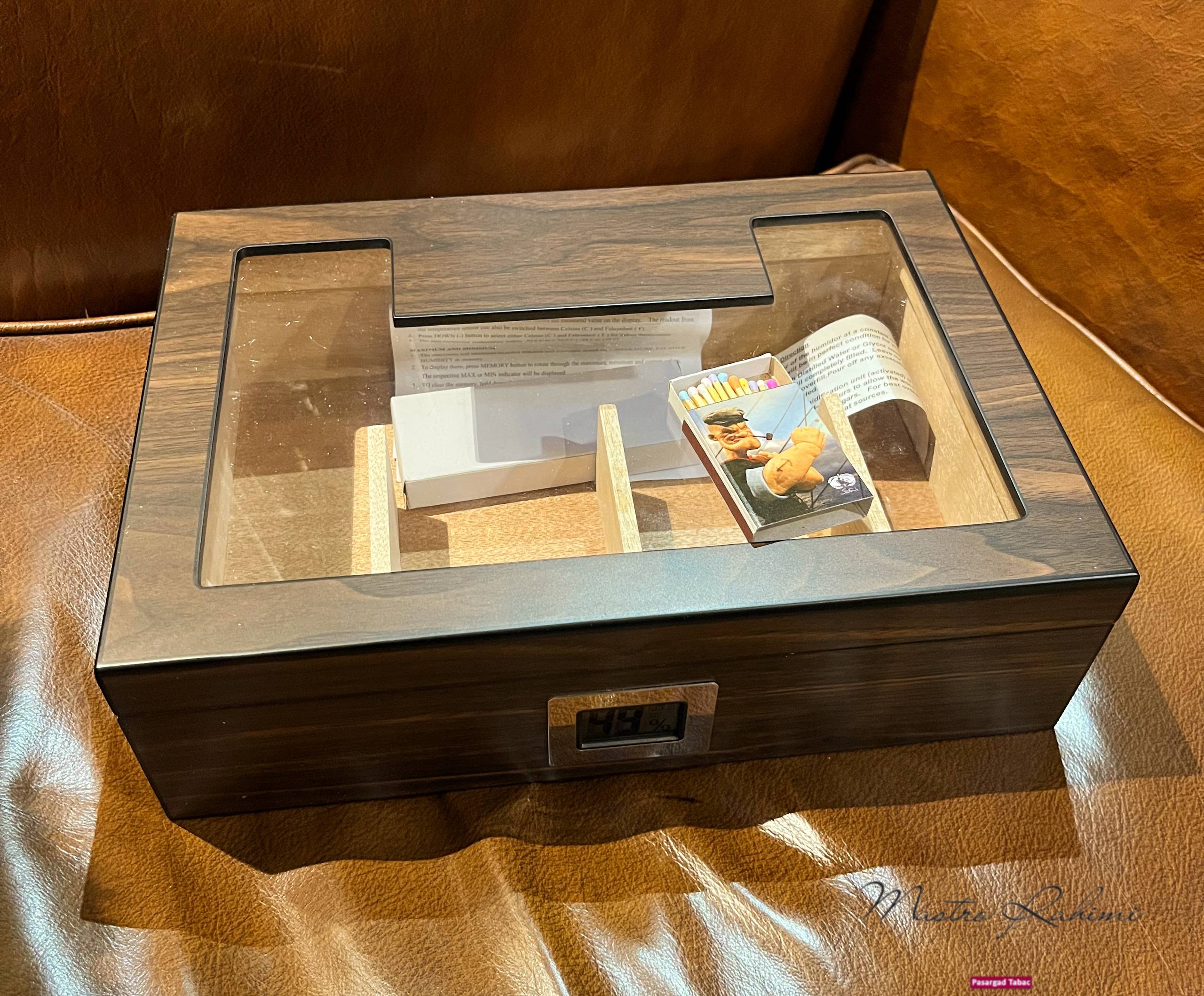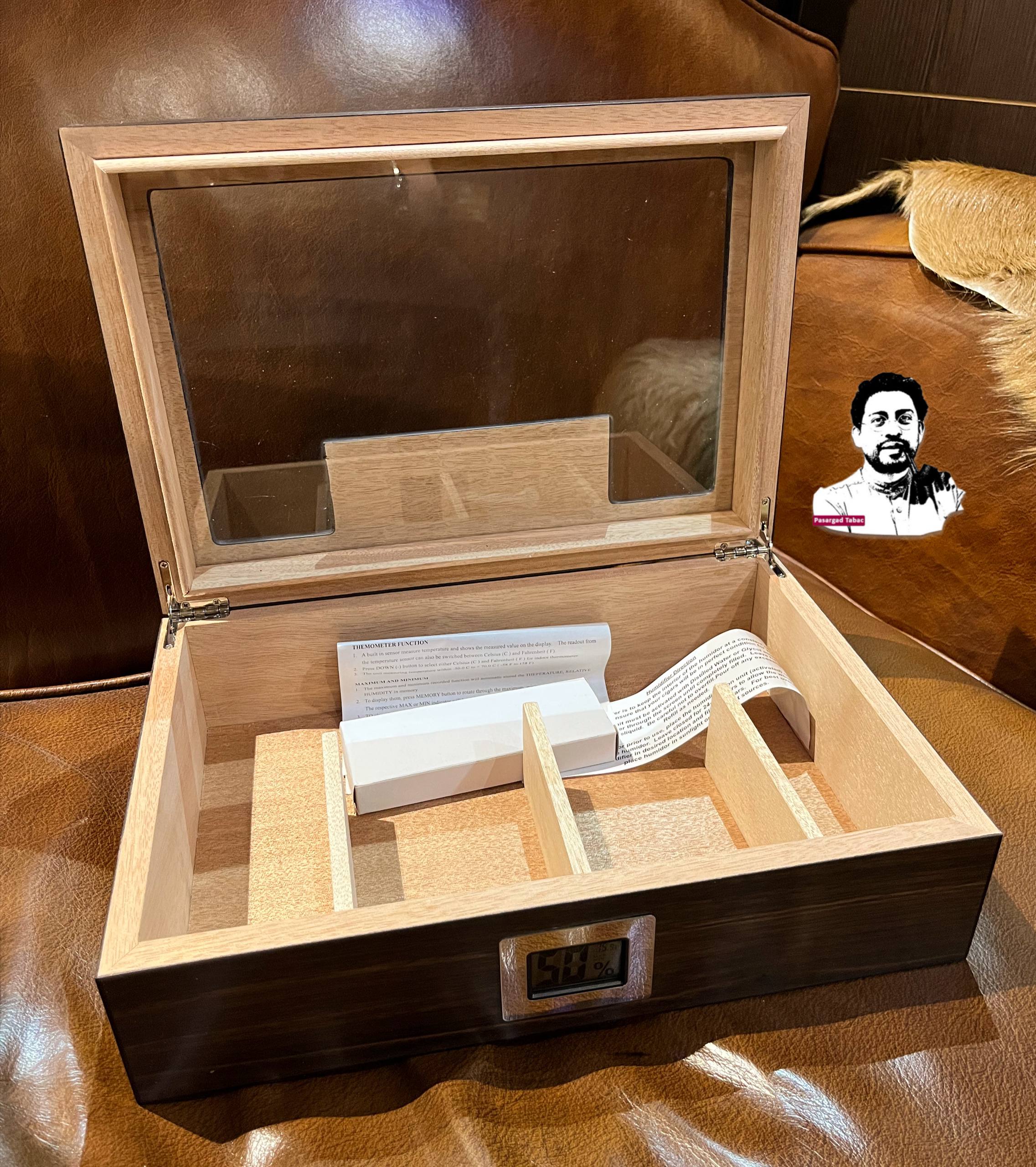 SCATOLA UMIDIFICATA con humidor interno e igrometro digitale con lettura esterna. Top in vetro permette di vedere i propri sigari.